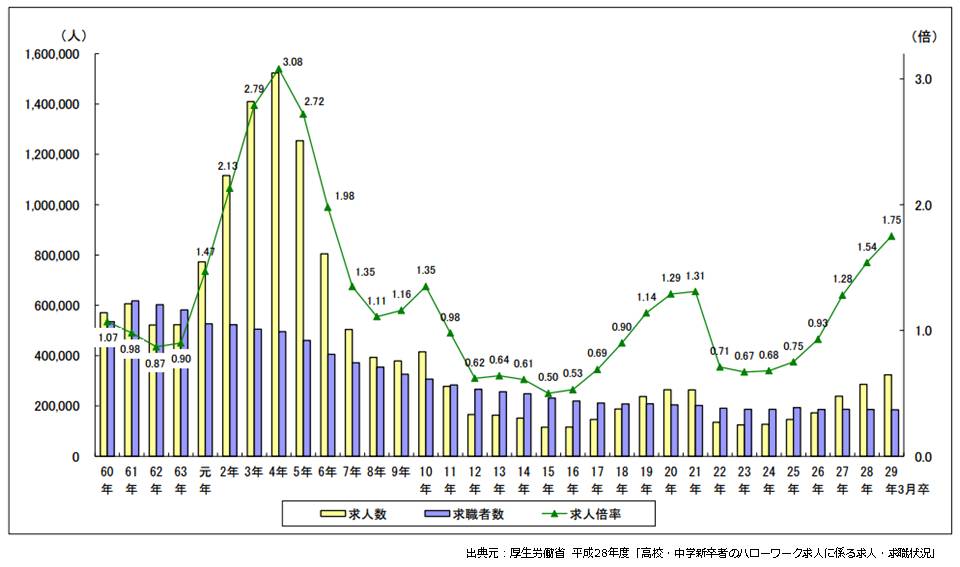 倍率が1.0以上:就職を希望する高校生の数よりも高校生を採用したい企業数の方が多く、内定を獲得しやすい